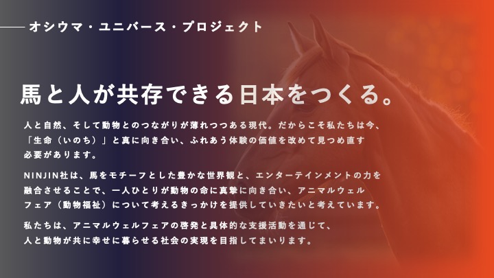 「オシウマ・ユニバース・プロジェクト」とは、馬をモチーフにした豊かな世界観を通じて、アニマルウェルフェア(動物福祉)への関心と理解を広めることを目的とした取り組みです。